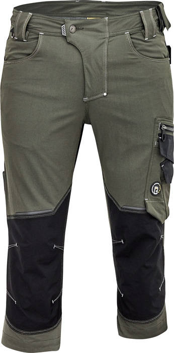 Popis: pánské pracovní 3/4 kalhoty, elastický inovativní materiál TRIFIBETEX PRO®, slim střih, snížený pružný pas, odolné trojité prošití nohavic a sedu, CORDURA zesílená oblast kolen, prostorné multifunkční přední kapsy s poutky na nářadí, 2 zadní kapsy na suchý zip, stehenní kapsa na telefon s klopou a zapínáním na suchý zip, kapsa na metr a nůž, poutko na kladivo, "D" kroužek, poutko na nářadí v pase, originální zpracování zapínání kalhot, reflektivní prvky v barevném odstínu.
