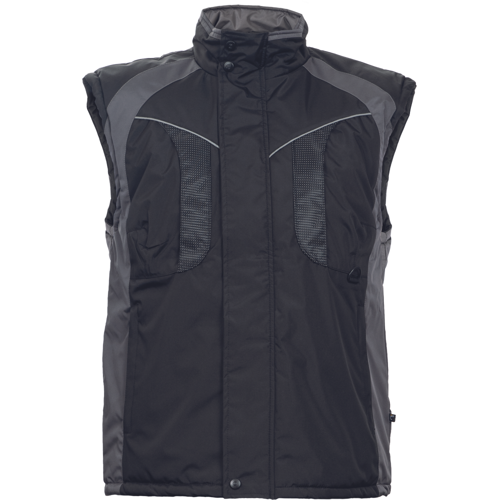 Popis: zateplená nepromokavá pánská zimní vesta se stojáčkem; mechanicky odolná úprava RipStop; zapínání na zip kryté légou; spodní lem ke stažení na šňůrku; 2 postranní kapsy, 2 náprsní kapsy; reflexní doplňky.