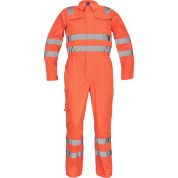 Popis: pánský lehký full HI-VIS pracovní overal s reflexními pruhy přes ramena, v bocích, na rukávech a nohavicích; elastický pas, zapínání na zip kryté légou na suchý zip; 2 postranní kapsy, 1 kapsička na mince; 1 multifunkční stehenní kapsa; 2 náprsní kapsy s klopou; 2 zadní kapsy; nastavitelná délka nohavic