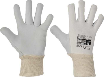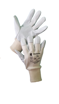 Rukavice šité z jemné lícové ovčiny v dlani, bílé bavlněné tkaniny na hřbetu a s nápletem.