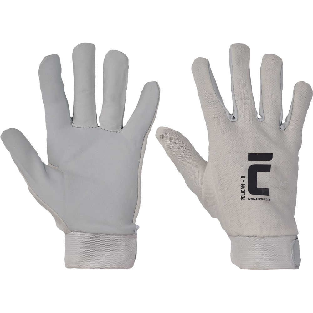 Rukavice šité z jemné lícové ovčiny v dlani, bílé bavlněné tkaniny na hřbetu a manžetou na suchý zip.