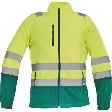 Popis: pánská full HI-VIS fleecová mikina s reflexními pruhy přes ramena, v bocích a na rukávech; zapínání na zip; 1 náprsní kapsa a 2 postranní kapsy na zip; elastické lemy rukávů a boků.