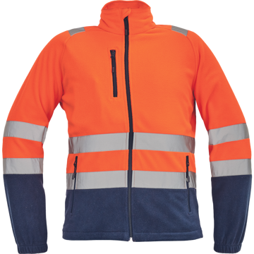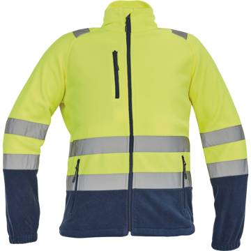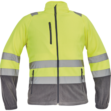 Popis: pánská full HI-VIS fleecová mikina s reflexními pruhy přes ramena, v bocích a na rukávech; zapínání na zip; 1 náprsní kapsa a 2 postranní kapsy na zip; elastické lemy rukávů a boků.