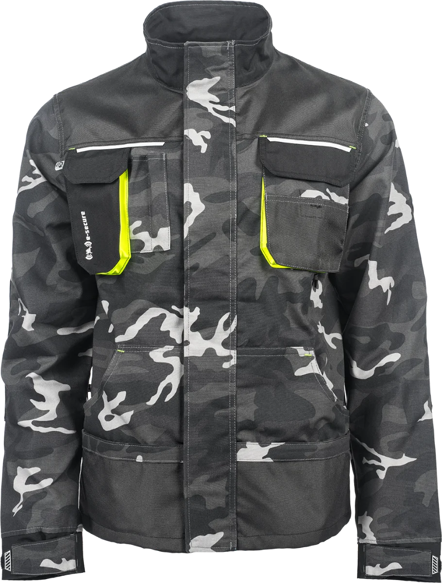 • pánská pracovní bunda • zapínání kryté légou na suchý zip • v moderní úpravě šedé kamuflážové barvy • 2 přední kapsy • 2 náprsní kapsy • 1 náprsní kapsa na mobilní telefon • Oxford 600D zesílení loktů • reflexní prvky • kontrastní prošití
