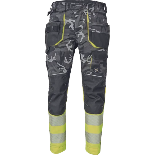 • pánské pracovní HI-VIS kalhoty s pružným pasem a multifunkčními kapsami • v moderní úpravě šedé kamuflážové barvy • Oxford 600D zesílení kolenních kapes pro vkládání ochranných nákoleníků • odolné trojité prošití nohavic a sedu • 2 tištěné reflexní segmentované 7 cm pruhy na spodní části nohavic • nastavitelná délka nohavic