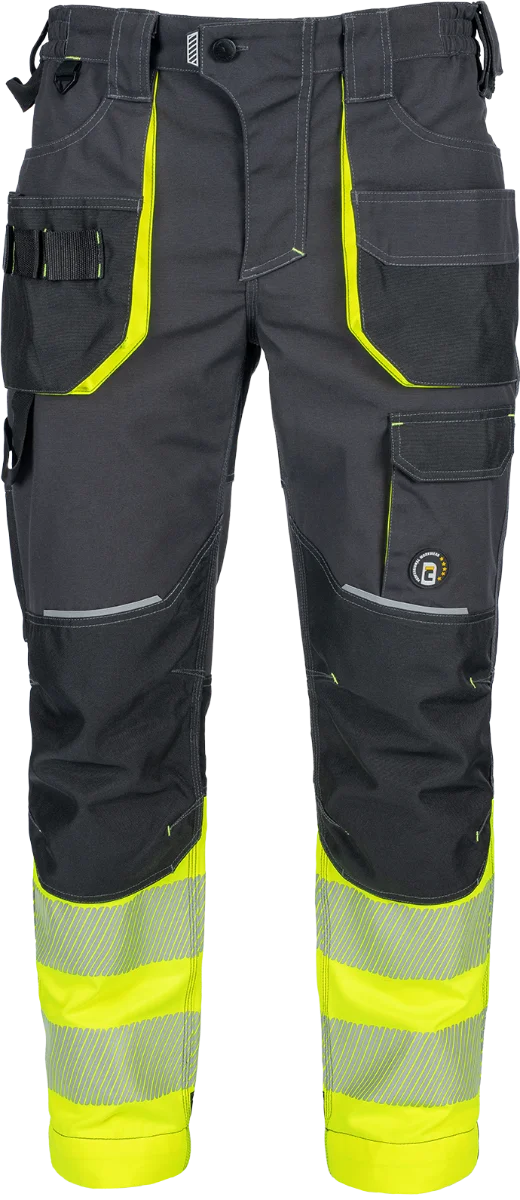 • pánské pracovní HI-VIS kalhoty s pružným pasem a multifunkčními kapsami • Oxford 600D zesílení kolenních kapes pro vkládání ochranných nákoleníků • odolné trojité prošití nohavic a sedu • 2 tištěné reflexní segmentované 7 cm pruhy na spodní části nohavic • nastavitelná délka nohavic