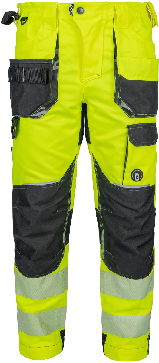 • pánské pracovní HI-VIS kalhoty s pružným pasem a multifunkčními kapsami • Oxford 600D zesílení kolenních kapes pro vkládání ochranných nákoleníků • odolné trojité prošití nohavic a sedu • 2 tištěné reflexní segmentované 7 cm pruhy na spodní části nohavic • nastavitelná délka nohavic