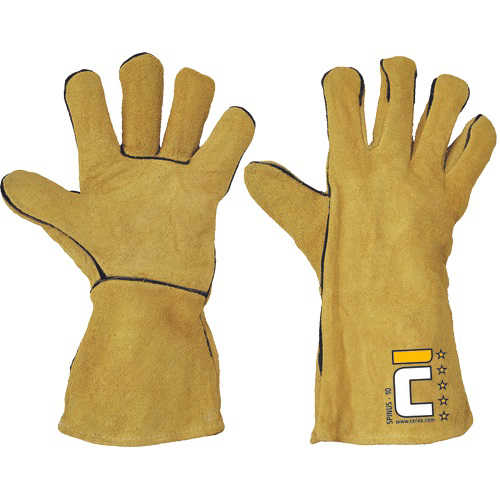 Rukavice ze žluté hovězí štípenky s krytými švy šitými kevlarovou nití a bavlněnou podšívkou.