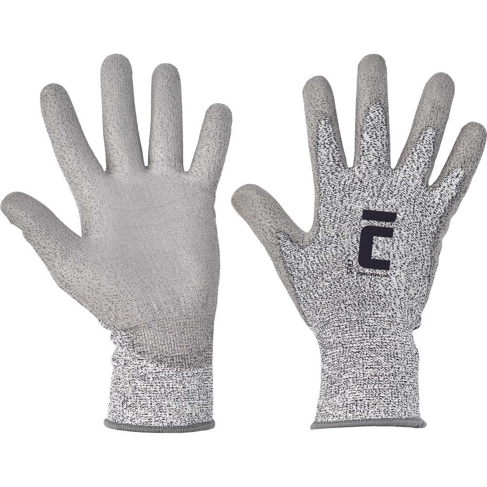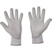 Pletené bezešvé rukavice kategorie prořezu B, šedý PU na dlani a prstech.