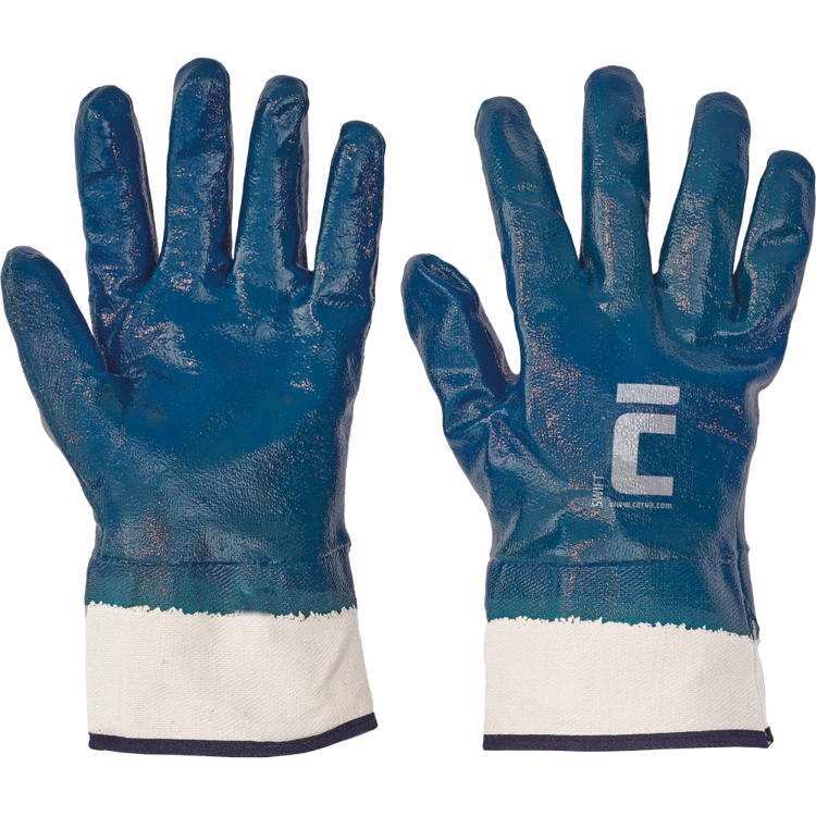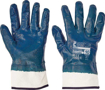 Modré rukavice šité z bavlneného úpletu, celomáčané v nitrile, s pevnou manžetou.