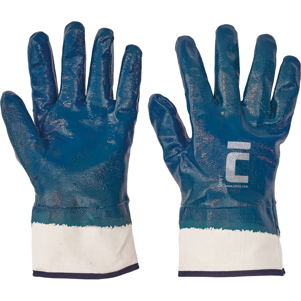 Modré rukavice šité z bavlneného úpletu, celomáčané v nitrile, s pevnou manžetou.