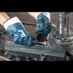 Modré rukavice šité z bavlneného úpletu, celomáčané v nitrile, s pevnou manžetou.