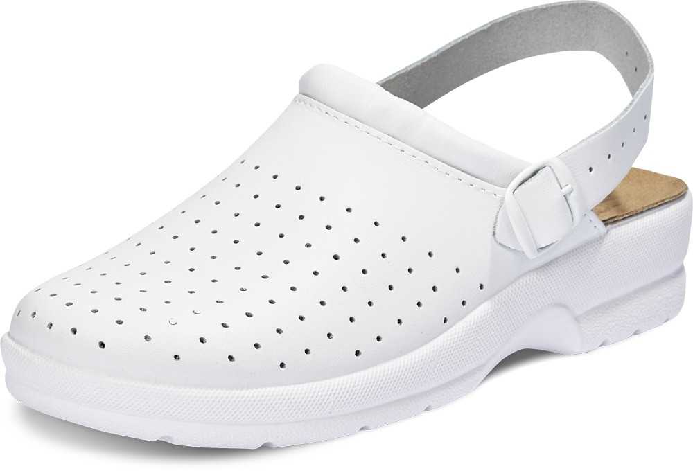 Popis:Dámské a pánské pantofle s nastavitelným páskem na patě. Pohodlná PU podešev je vybavená stélkou ze semišové kůže. Perforovaný svršek je vyroben z povrstvené kůže.Materiál:Svrchní materiál: foliovaná kůžeMateriál podešve: jednohustotní polyuretanMateriál podšívky: broušená kůžeNormy:EN ISO 20347 (OB E SRA)Vlastnosti:Vyrobeno v EUProdyšný svršekPodešev odolná olejům - FOObuv ve velikostech od 35Protiskluzová podešev - SR (A/B/C)