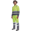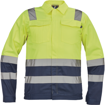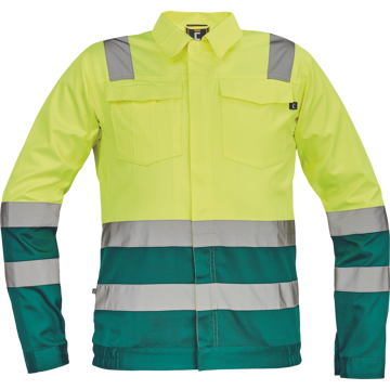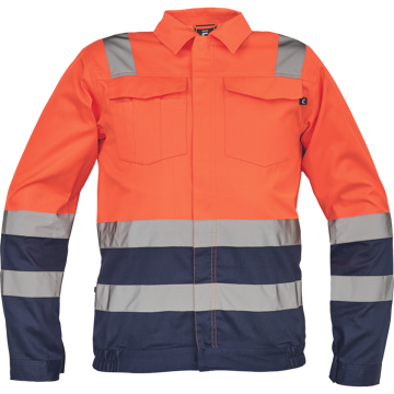 Popis: pánská lehká HI-VIS pracovní bunda s reflexními pruhy přes ramena, v bocích a na rukávech; zapínání na zip kryté légou na suchý zip; 2 náprsní kapsy s klopou; elastický lem v bocích; nastavitelná šířka rukávů pomocí suchého zipu