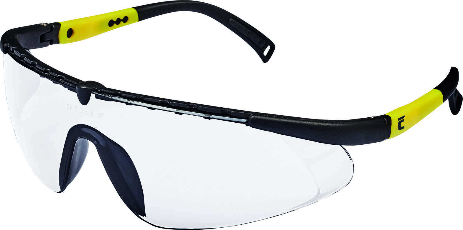 Brýle sportovního vzhledu optické třídy 1 s polykarbonátovým zorníkem s úpravou proti poškrábání a orosení (třída F dle normy EN 166), ochranou proti nárazu s malou energií a nastavitelnou délkou stranic. Žlutý zorník má ochranný filtr proti UV záření dle normy EN 170, šedý zorník má ochranný protisluneční filtr dle normy EN 172.