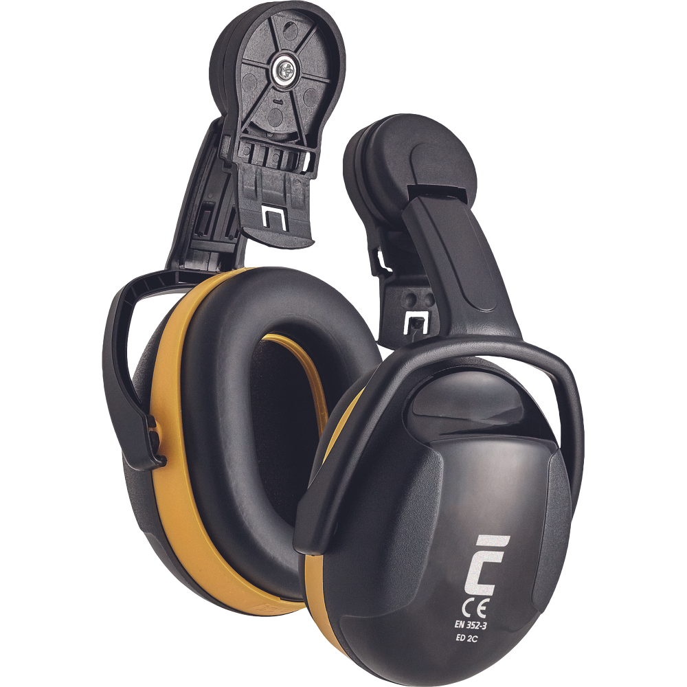 Výkonný dielektrický mušlový chránič sluchu s upevněním na ochrannou přilbu(štěrbina 30 mm), se snadno nastavitelným a stabilním teleskopickým upravením velikosti, s pěnou plněnými těsnícími polštářky.