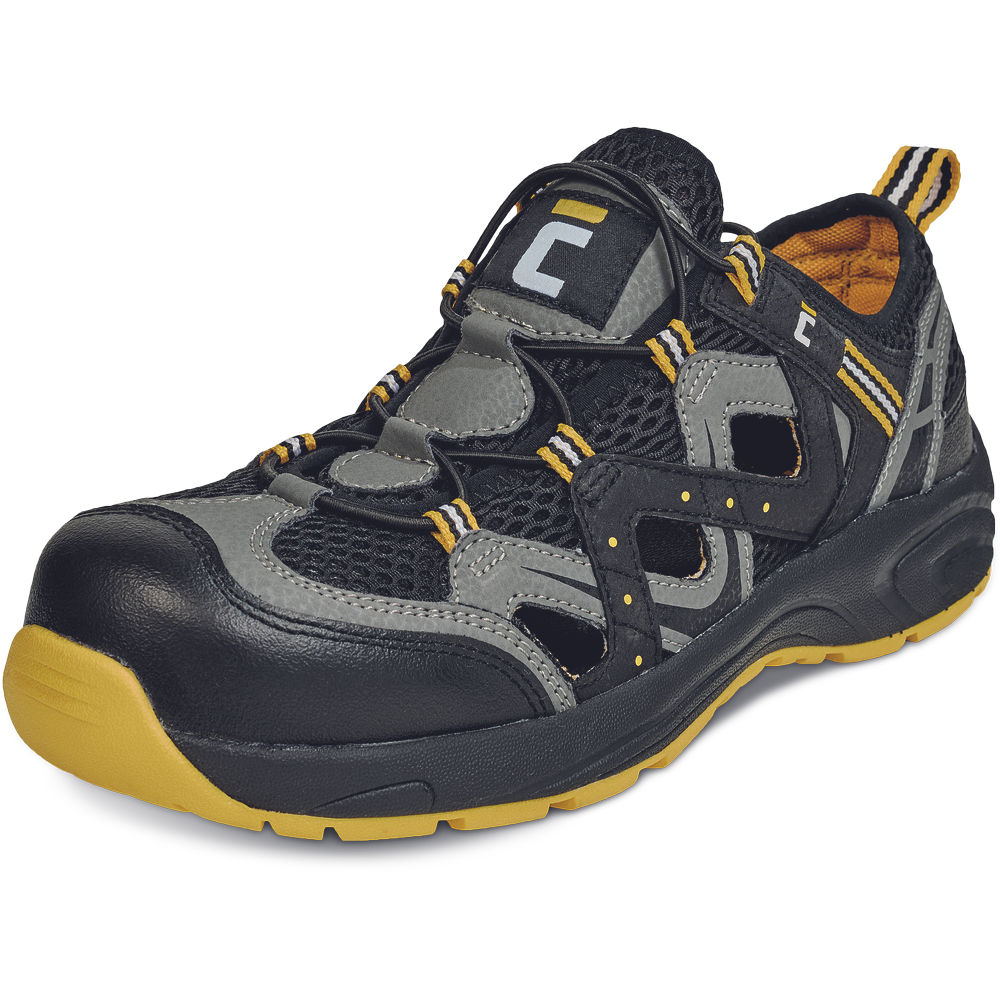 Extrémně lehký a pohodlný pracovní sandál vhodný pro nenáročnou práci ve vnitřních prostorech nebo venku během letního období. Svršek obuvi je vyrobený z přírodní kůže a prodyšné síťoviny, díky čemu je garantovaná správná cirkulace vzduchu. Podešev vyrobená z kombinace phylonu a gumy zajišťuje nejenom perfektní protiskluzové vlastnosti, ale také vysokou odolnost proti opotřebení. Uzavíraní pomocí elastických tkaniček umožnuje ideálně přizpůsobit obuv k tvaru nohy. Žluté doplňky zvyšují viditelnost uživatele.