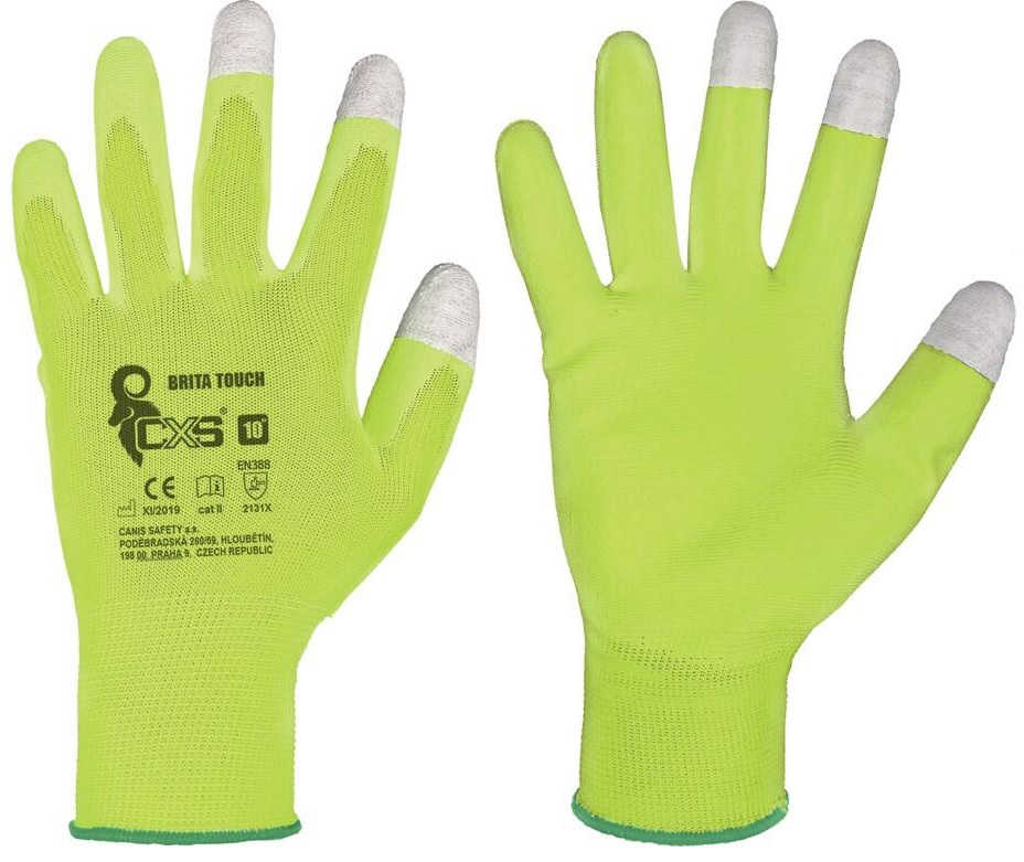Popis: Pletené bezešvé rukavice z polyesteru, s tenkou vrstvou polyuretanu v dlani a na prstech.V koncích palce, ukazováčku a prostředníku měděné vlákno pro práci s dotykovými displeji.