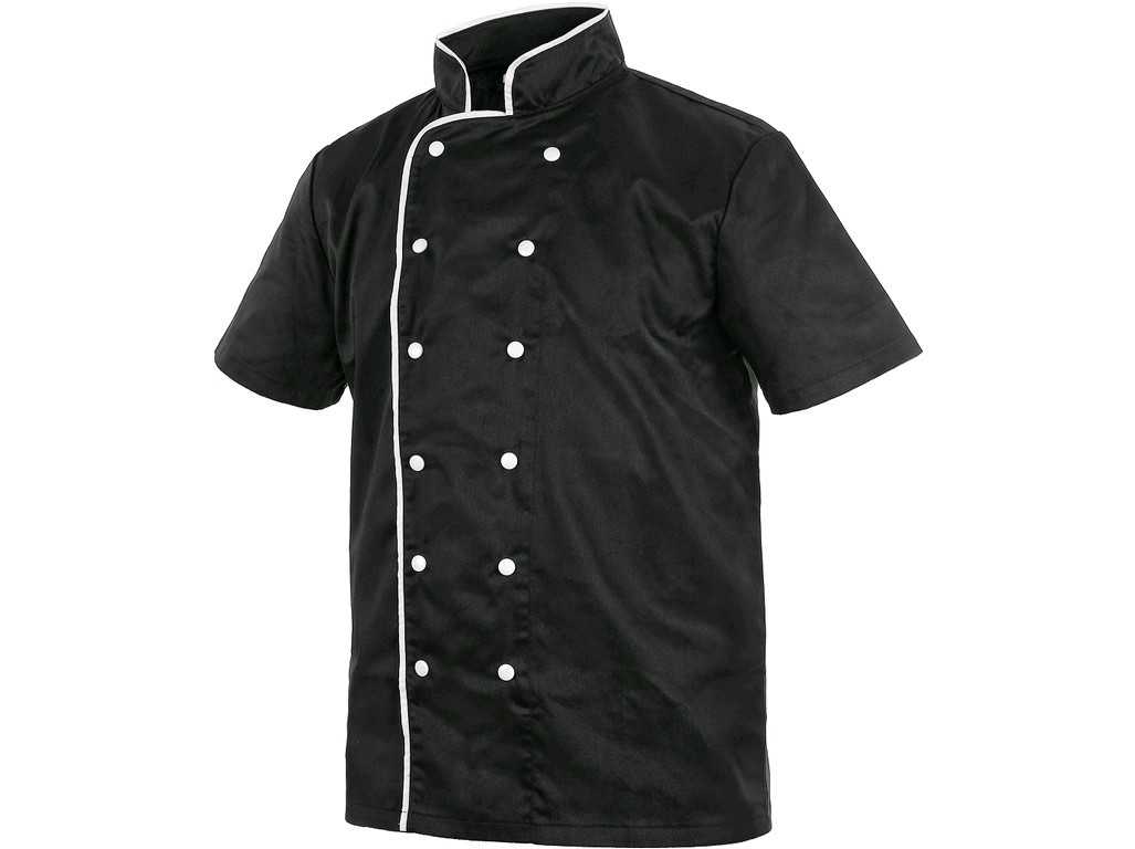 Popis: kuchařský rondon v moderním designu, s krátkým rukávem a stojákem, dvouřadé zapínání na knoflík. Vhodné pro výšivku a potisk.