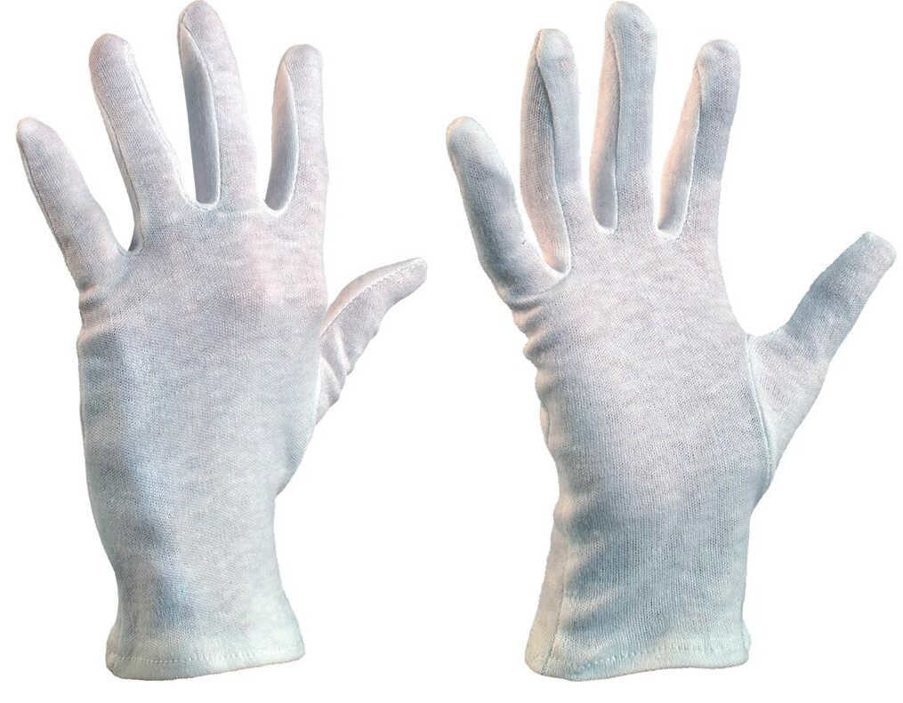 Popis: Textilní šité rukavice z běleného bavlněného úpletu, střih fourchette.
