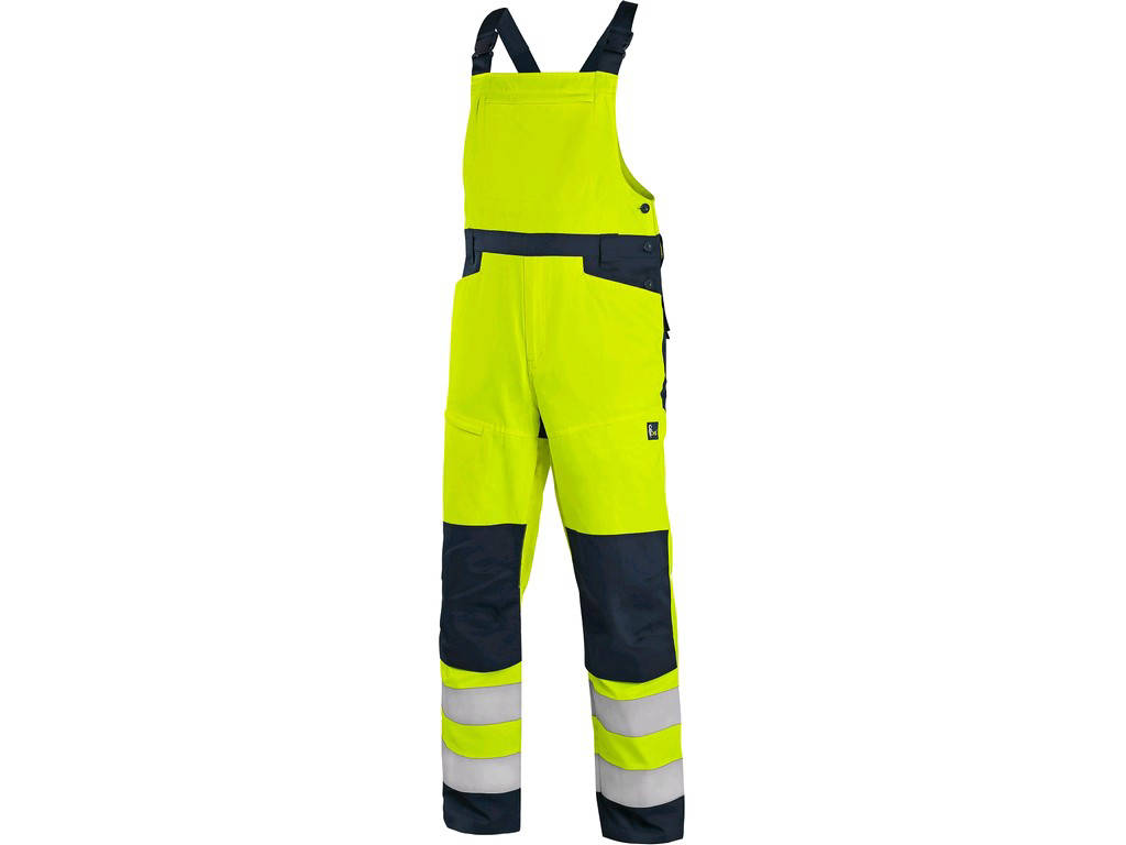 Popis: Pánské výstražné kalhoty s náprsenkou, letní, šle s gumou vzadu, náprsní kapsa na zip, boční zapínání na knoflíky, kryté přední zapínání na zip, 2 přední kapsy, 2 zadní kapsy s klopou na suchý zip, pravá boční kapsa na zip, zdvojená kolena s možností vložení kolenních výztuh, v zadní kolenní části mesh materiál zajišťující lepší odvětrávání, reflexní pásky (šíře 7 cm). V kombinaci s blůzou Halifax splňují ochrannou kategorii 3 (norma EN ISO 20471).