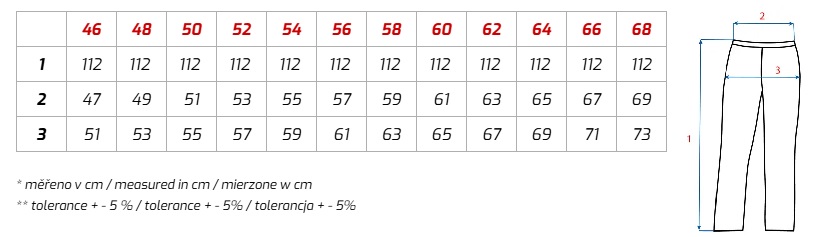 Pánské montérkové kalhoty, pas s poutky na opasek, vzadu do gumy, přední kapsy, boční kapsa na svinovací / skládací metr, boční kapsa na mobil / peněženku, zdvojená kolena, zadní kapsa s klopou, reflexní pruhy.