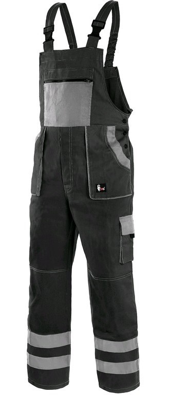 Popis: pánské montérkové kalhoty s náprsenkou, náprsní kapsa na zip, pas vzadu do gumy, přední kapsy, boční kapsa na svinovací / skládací metr, boční kapsa na mobil / peněženku, zdvojená kolena, zadní kapsa s klopou, šle s gumou vzadu, reflexní pruhy.