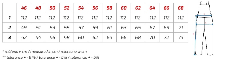Pánské montérkové kalhoty s náprsenkou, náprsní kapsa na zip, pas vzadu do gumy, přední kapsy, boční kapsa na svinovací / skládací metr, boční kapsa na mobil / peněženku, zdvojená kolena, zadní kapsa s klopou, šle s gumou vzadu, reflexní pruhy.