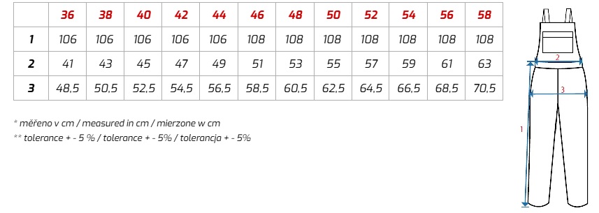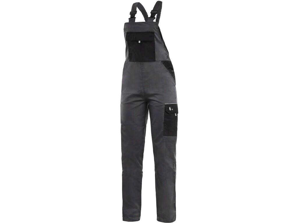 Dámské montérkové kalhoty s náprsenkou, z lehkého materiálu, náprsní kapsa s klopou, přední klínové kapsy, boční kapsa s klopou, kapsa na skládací/svinovací metr, zadní jednoduchá kapsa, šle vzadu na gumu, reflexní doplňky. Díky odlehčené gramáži vhodné pro práci nejen v letním období, ale také celoročně ve vytápěných provozech.