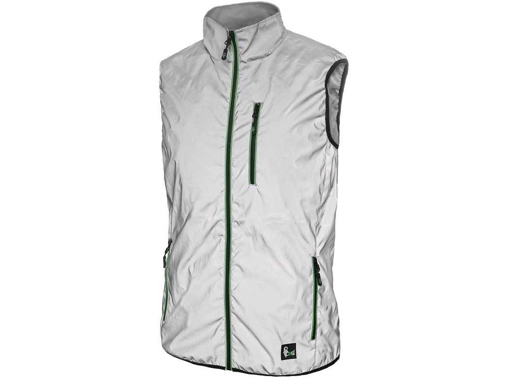 Popis: Lehká propínací vesta, UNISEX, díky speciálnímu materiálu zvyšuje viditelnost osoby, náprsní kapsa na zip, 2 spodní kapsy, zelené výpustky kolem zipů, spodní lem do gumičky, podšívka ze síťoviny. Nejedná se o ochranný vystražný oděv.
