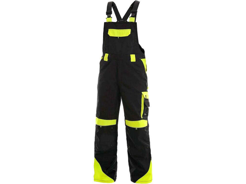 Popis: pánské montérkové kalhoty zateplené flanelem, s náprsenkou, náprsní kapsa s klopou, pas s poutky na opasek, přední klínové kapsy, multifunkční kapsy na obou stranách, kolena zesílena materiálem 600D polyesterem s možností vložení kolenních výztuh, dvě zadní kapsy s klopami, šle s gumou vzadu, reflexní doplňky.