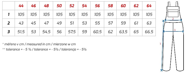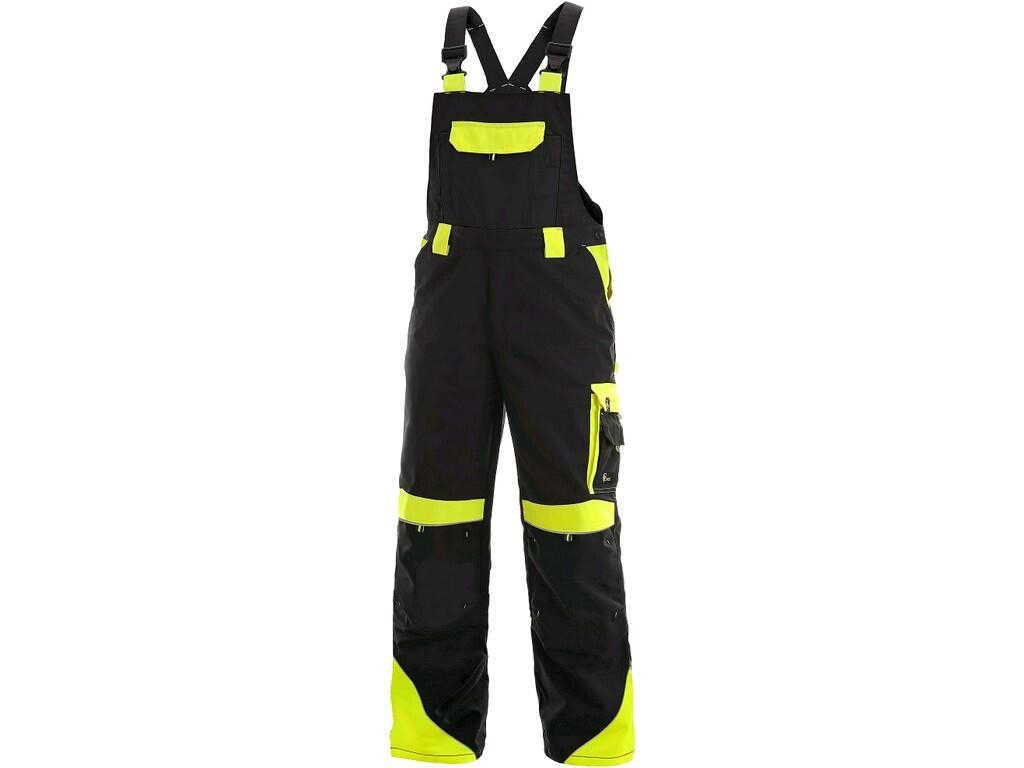 Pánské montérkové kalhoty s náprsenkou - zkrácená varianta na výšku 170-176 cm. Náprsní kapsa s klopou, pas s poutky na opasek, v zadní části guma s knoflíkem pro přizpůsobení velikosti, přední klínové kapsy, multifunkční kapsy na obou stranách, kolena zesílena materiálem 600D polyesterem s možností vložení kolenních výztuh, dvě zadní kapsy s klopami, šle s gumou vzadu, reflexní doplňky.