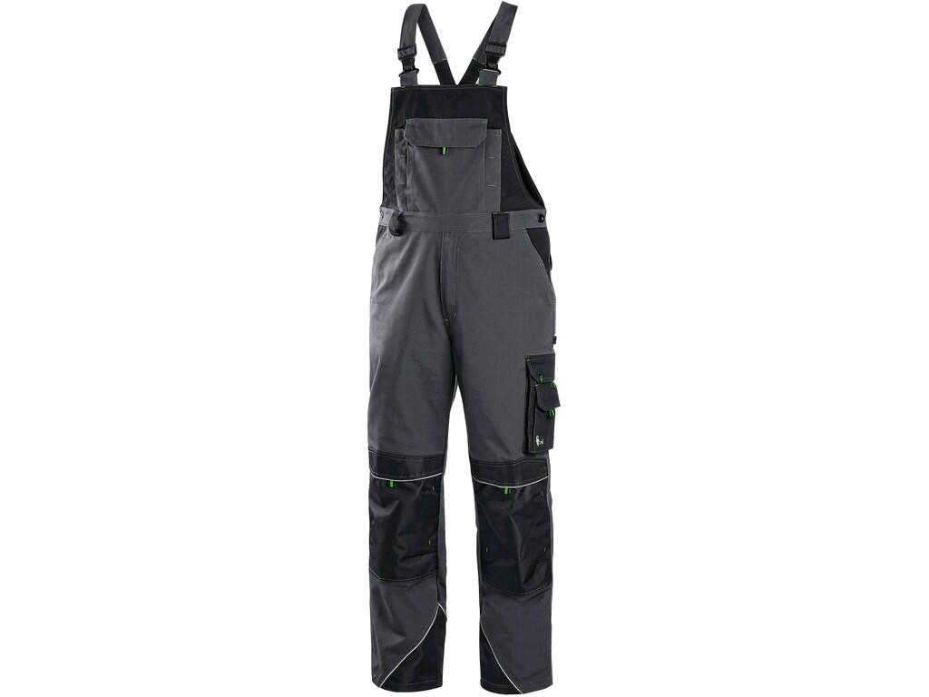 Pánské montérkové kalhoty s náprsenkou, náprsní kapsa s klopou, pas s poutky na opasek, v zadní části guma s knoflíkem pro přizpůsobení velikosti, přední klínové kapsy, multifunkční kapsy na obou stranách, kolena zesílena materiálem 600D polyester s možností vložení kolenních výztuh, dvě zadní kapsy s klopami, spodní část nohavic vyztužena materiálem 600D polyester, šle s gumou vzadu, reflexní doplňky.