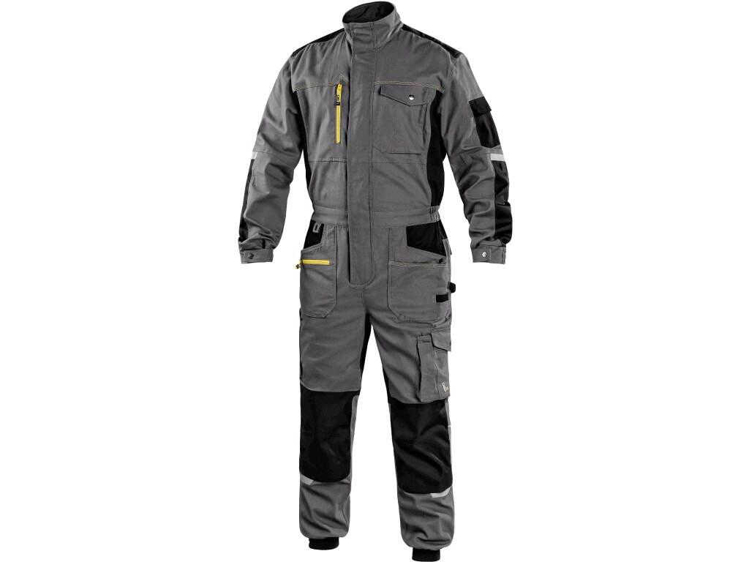Popis: Pánská pracovní kombinéza, strečová tkanina umožňující volný pohyb, ramena vyztužena 600D polyesterem, rukávy s nastavitelnou manžetou, kapsička s klopou na levém rukávu, kryté zapínání na zip a druky, náprsní kapsy - na druk a zip, dvoucestný zip, ventilace na zádech, pas s gumou v bocích, přední kapsy s kapsou na zip, multifunkční kapsy na obou stranách, kolena zesílena 600D polyesterem s možností vložení kolenních výztuh, dvě zadní kapsy, jedna s klopou, pružná manžeta na nohavicích, reflexní doplňky.