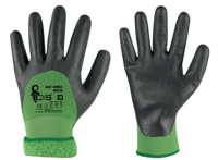 Pletený bezešvý polyester, rukavice s tenkou vrstvou polyuretanu na dlani a prstech a elastickou manžetou.