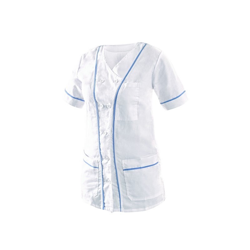 Popis: dámská halena s krátkým rukávem, 3 kapsy, bílá s modrým proužkem.