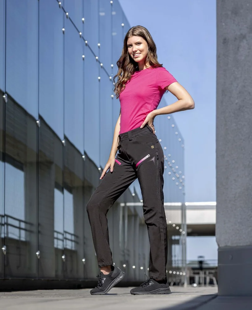 Dámské softshellové kalhoty mají přiléhavý střih SLIM FIT. Čtyřsměrně elastický odlehčený softshell ElasticTech®Flexi s membránou je vhodný i pro náročné aktivity, výborně chrání před větrem, je voděodolný, rychle schne a udržuje optimální tělesnou teplotu. Ventilační zipy se síťovinou na vnější straně stehen. Zadní díl člení sedlo, na předním dílu 2 zipové kapsy, pružný, tvarovaný obvod pasu zvyšuje komfort při nošení. Funkční tvarování nohavic, zúžený střih, spodní lem nohavic s možností nastavení obvodu pomocí druků, vnitřní háček s gumou pro upevnění nohavic k obuvi. Design dokreslují 3D reflexní potisky.