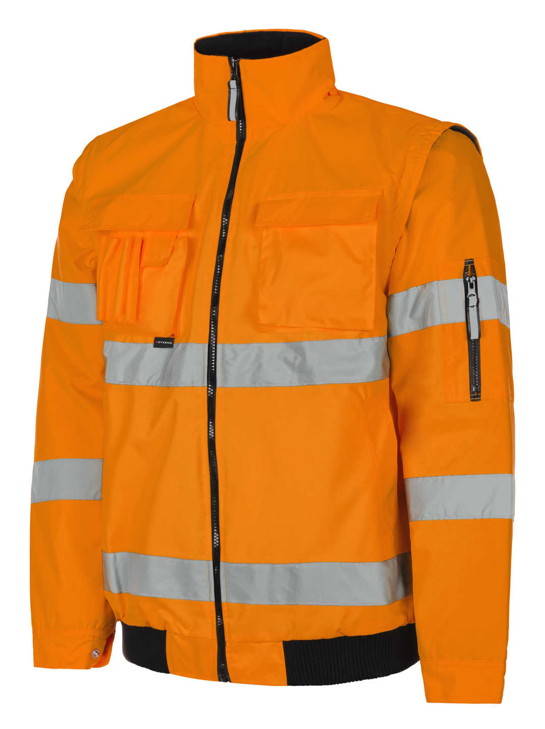 Výstražná bunda Aginola, 2v1 nepromokavá, zateplená, reflexní pásky, odepínací rukávy. Výstražná bunda, je vybavena reflexními pásky, kapuce je ukryta v límci. Ušita z nepromokavé látky, odepínací rukávy, 4 kapsy + 1 na rukávu, vnitřní kapsa. Zateplení reflexní bundy je řešeno materiálem PES, stejně jako použitá podšívka, má přelepené švy a polopružný pas. Límec s fleecovou úpravou. Vhodné použití: do míst se zvýšeným nebezpečím úrazu, především v noci a za nízké viditelnosti. Voděodolnost tř. 3 dle normy EN 343 a paropropustnost tř. 1 dle normy EN 343 DYKENO Visibility znamená vysoká viditelnost díky reflexním pruhům. Vysoce účinná svítivost reflexní vrstvy opatřená povrchovou úpravou proti opotřebení. Velikosti: S - 3XL Barva: reflexní oranžová, reflexní žlutá Materiál: 100% polyester 300D oxford / PU EN ISO 13 688 EN ISO 20471 EN 343 3/1