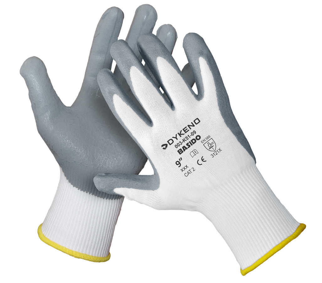 Z jemného nylonového úpletu se spandexem, pružná manžeta, dlaň a prsty jsou pokryté pěnovým nitrilem. Rukavice Basido jsou ideální do lehkého průmyslu, automobilového průmyslu, pro montážní práce atd.Manipulace s malými předměty. Vyšší odolnost ve vlhkém prostředí. Montáž a balení malých součástek. Manipulace s kovovými díly ve výrobních linkách, montáž lehce zaolejovaných kovových dílů a komponentů. Pěnový nitril zajišťuje jedinečný cit a úchop díky materiálu DYKENO Ergonic.Velikost: 6 - 11EN 388: 3121XKategorie II