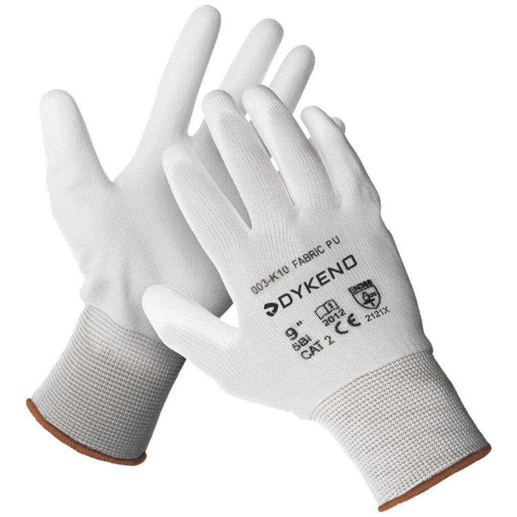 Z jemného polyesteru, mají pružnou manžetou, dlaň a prsty jsou pokryté tenkou vrstvou polyuretanu. Rukavice Fabric jsou skvělé do lehkého průmyslu, automobilového průmyslu, pro montážní práce atd. Manipulace s malými předměty. Montážní práce v suchém a lehce zaolejovaném prostředí. Montáž a balení malých součástek. Výborné pro montážní práce, skvělá odolnost proti oděru díky vrstvě Dykeno Grip. Tenká vrstva polyuretanu zajišťuje jedinečný cit a úchop díky materiálu Dykeno Ergonic, zároveň má komfortní prodyšnost díky Dykeno Air.