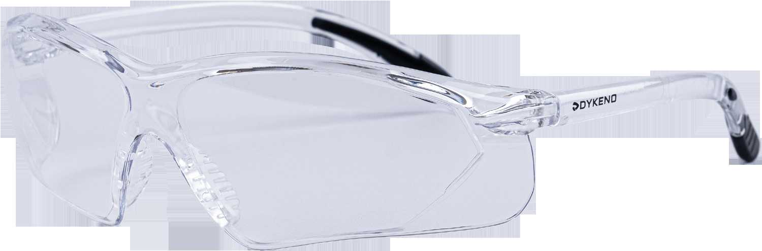 Brýle s prodlouženým polykarbonátovým zorníkem. Nylonové postranice s měkkým gumovým zakončením. Široké zorné pole. Atypický tvar zorníku. Velmi lehké, UV filtr. Nosník z měkkého gumového materiálu.Úprava proti poškrábání pro zvýšení použitelnosti. Úprava proti zamlžování. Atypický tvar zorníku. Velmi lehké, UV filtr. Ochrana proti částicím s vysokou rychlostí nárazu s nízkou energií. Optická třída 1. Mechanická ochrana F. Technologie DYKENO Clear zajišťuje maximální průhlednost zorníku.Zorník: čirýEN 166EN 170