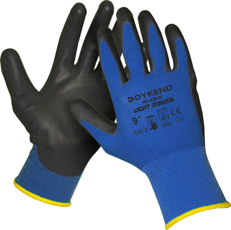 Povrstvené rukavice pro práci s dotykovou obrazovkou. Polyuretanové povrstvení na dlani, prstech a části hřbetu. Prodyšný polyesterový úplet - vzdušný na nepovrstvené části. Pružná manžeta zakončena lemováním s gumičkou.Odolnost proti oděru a mechanickým rizikům. Komfortní ovládání dotykových obrazovek. Mimořádné pohodlí. Výborné úchopové vlastnosti. Citlivost pro nejjemnější manipulaci a maximální přesnost.Dotykové obrazovky, NTB, tablety, telefony apod.Jemné montážní a seřizovací práce vyžadující vysokou přesnost. Montážní práce v suchém a lehce zaolejovaném prostředí. Strojírenství, automobilový průmysl. Montáž a balení malých součástek. Dokončovací práce a pasování malých dílů.Výborné pro montážní práce, skvělá odolnost proti oděru díky vrstvě DYKENO Grip. Tenká vrstva polyuretanu zajišťuje jedinečný cit a úchop díky materiálu DYKENO Ergonic, zároveň má komfortní prodyšnost díky DYKENO Air.Velikost: 6 - 11EN 388: 1131XKategorie II
