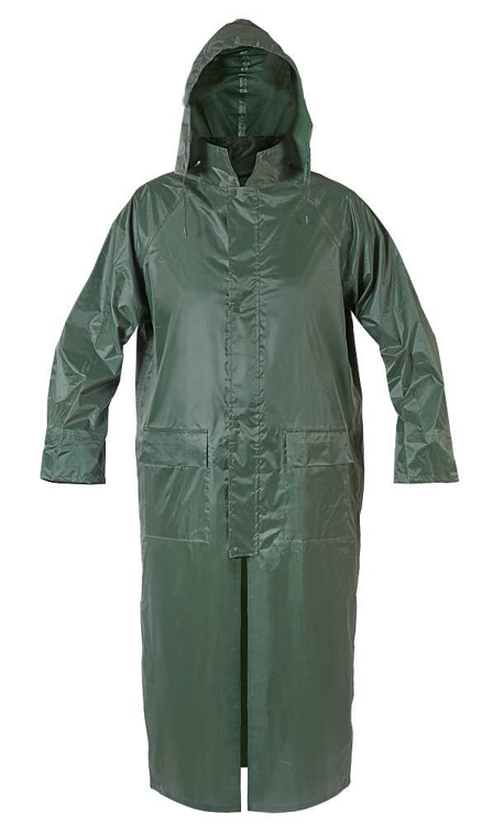 nepromokavý plášť s kapucízapínání na zip + překrytí légou na PVC cvočky větrání na zádech a v podpažíprodloužená délka ke kolenům 130 cm - pro překrytí obuvidvě kapsydvojité rukávy - vnitřní zakončený gumičkoupro venkovní práce nebo volnočasové aktivityVelikost: M - 4XLBarva: lahvově zelenáMateriál: 100% polyester / měkčené PVC