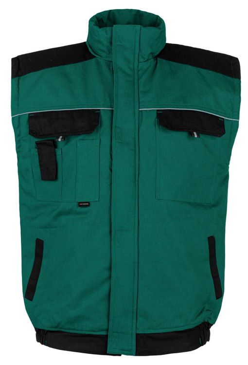 Zateplená vesta s multifunkčními kapsami. Náprsní kapsy, kapsa na mobil a tužku. Kapsy v bocích na suchý zip. Reflexní doplňky a to jak na předním, tak zadním dílu. Celopropínací zip, krytý légou, u krku navíc suchý zip. Na bocích pružná guma. Velkou výhodou jsou zesílená ramena. Prošívaná podšívka.Velikosti: M - 3XLBarva: zelená-černáMateriál: 100% bavlna 270 g/m2, zateplení 100% polyesterEN ISO 13688