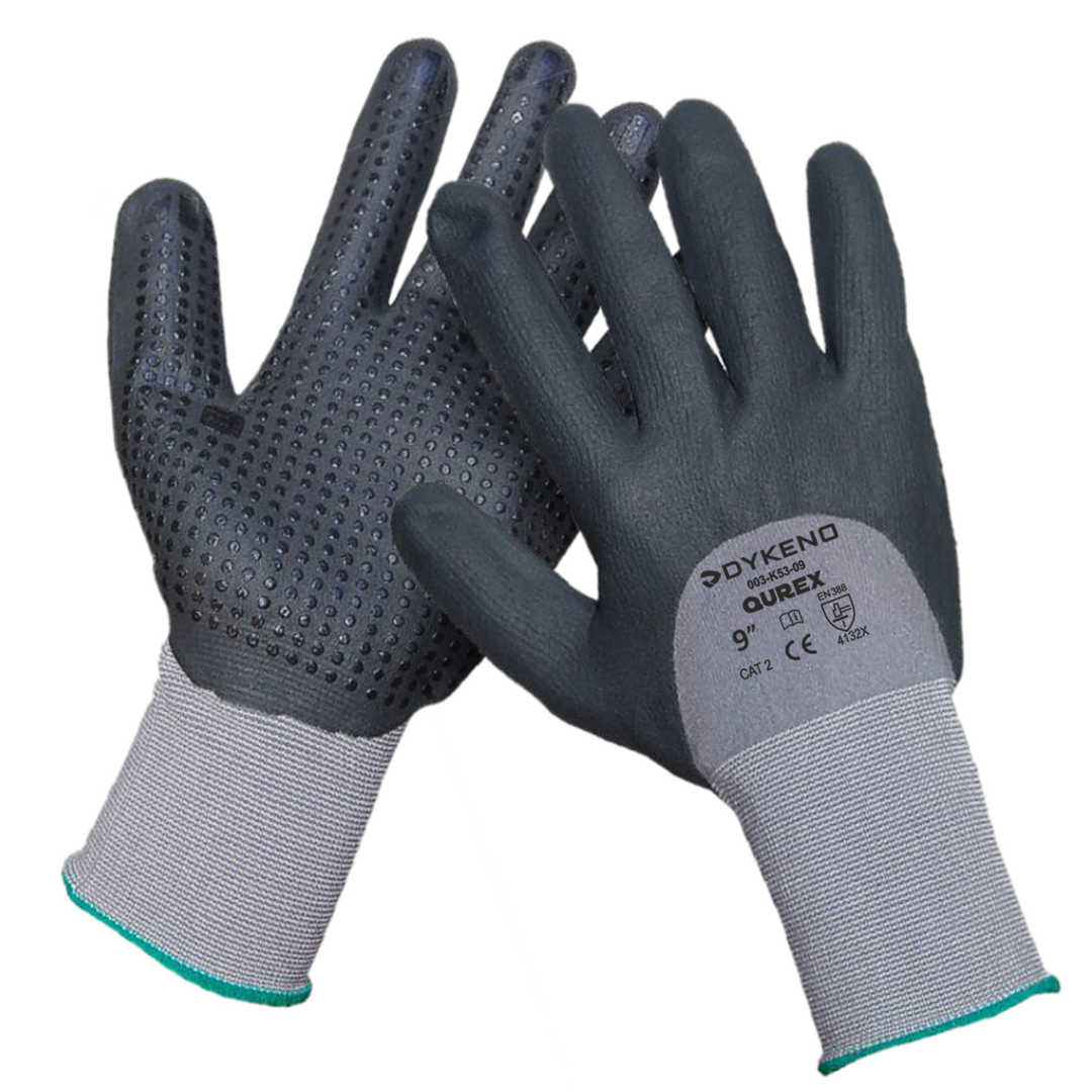 Prodyšné pracovní rukavice s nylonovým úpletem a spandexem. Skvělé díky povrstvení na dlani a prstech pěnovým nitrilem ze 3/4, nitrilové mikrovýčnělky na dlani. Vyztužená pružná manžeta zakončená lemováním s gumičkou.Vysoká odolnost proti oděru díky DYKENO Grip. Optimální pohodlí. Vyšší odolnost ve vlhkém prostředí díky DYKENO Dry. DYKENO Ergonic zajišťuje dobrý úchop a cit v ruce. Protiskluzné vlastnosti.Strojírenství a ostatní druhy průmyslu. Montáž lehce zaolejovaných kovových dílů a komponentů. Manipulace s kovovými díly na výrobních linkách. Manipulace s malými předměty. Proti mechanickým rizikům.Velikost: 6 - 11EN 388: 4132CAT 2