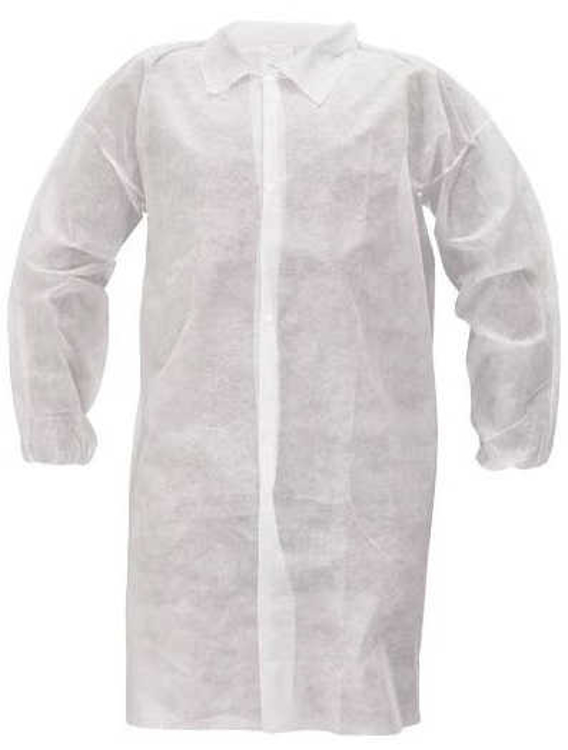 Ochrana proti zašpinění. Vyroben z netkaného polypropylenu. Vhodný především do potravinářského průmyslu. Návštěvnický jednorázový plášť se zapínáním na plastové druky, dlouhý rukáv.