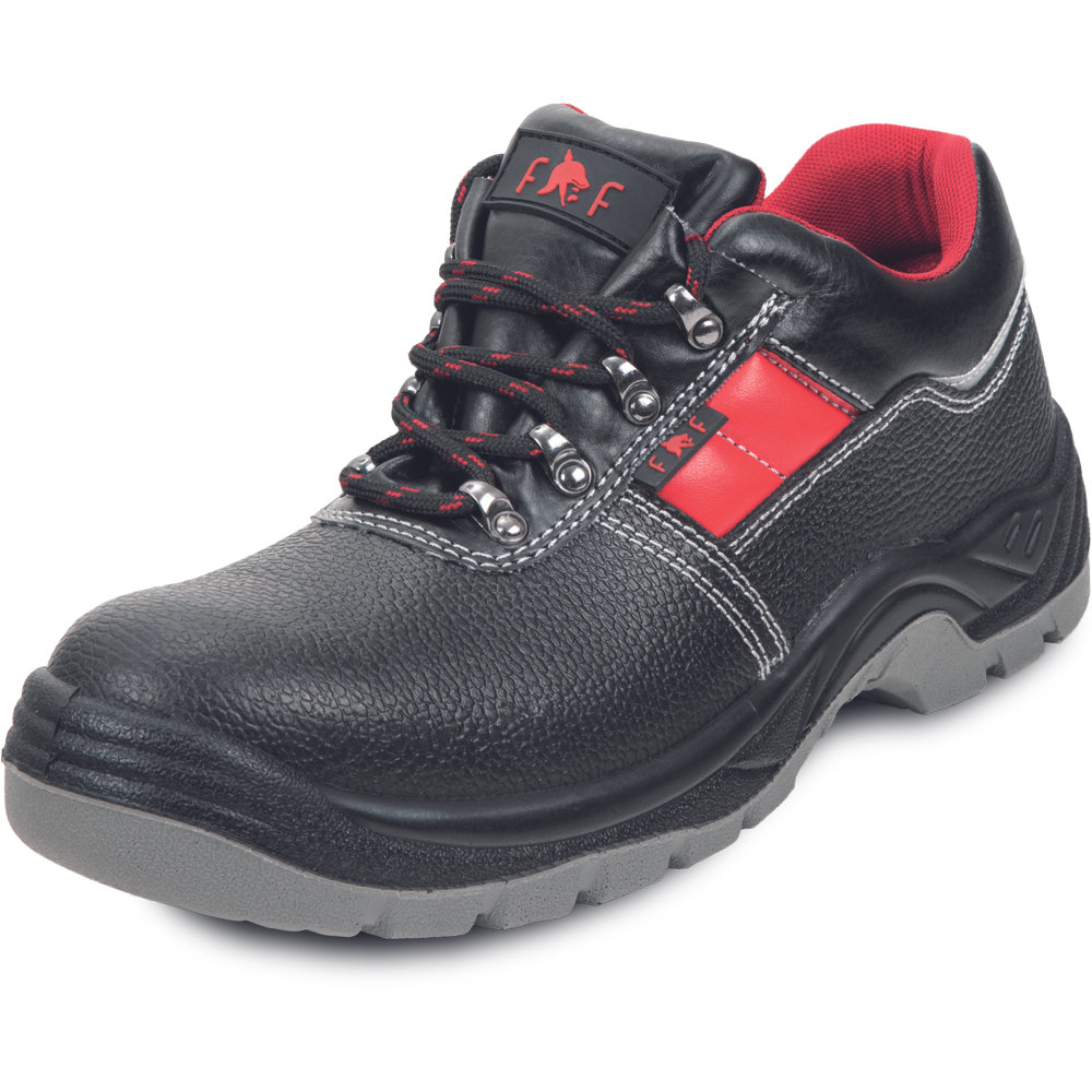 Bezpečnostní polobotka s ocelovou tužinkou, stélkou proti propíchnutí, PU/PU podrážkou rezistentní olejům. Svršek – reliéfní štípaná kůže. Stříbrné reflexní doplňky.