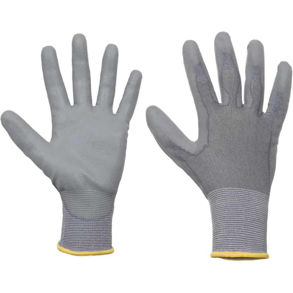 Pletené bezešvé polyesterové rukavice máčené v PU v dlani a na prstech, elastická manžeta.