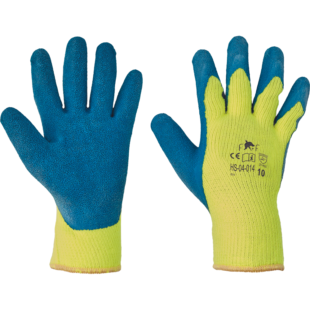Pletené bezešvé akrylové rukavice, polomáčené v přírodním latexu, se zdrsněnou dlaní.