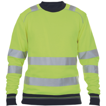 Popis: pánská HI-VIS mikina s kulatým průkrčníkem z počesaného výplňku směsi polyesteru a bavlny; kontrastní proužky v nápletech rukávů a spodním lemu; dvojice reflexních pruhů po obvodu pasu a rukávů a přes ramena; dekorativní prošití v HI-VIS barvě.